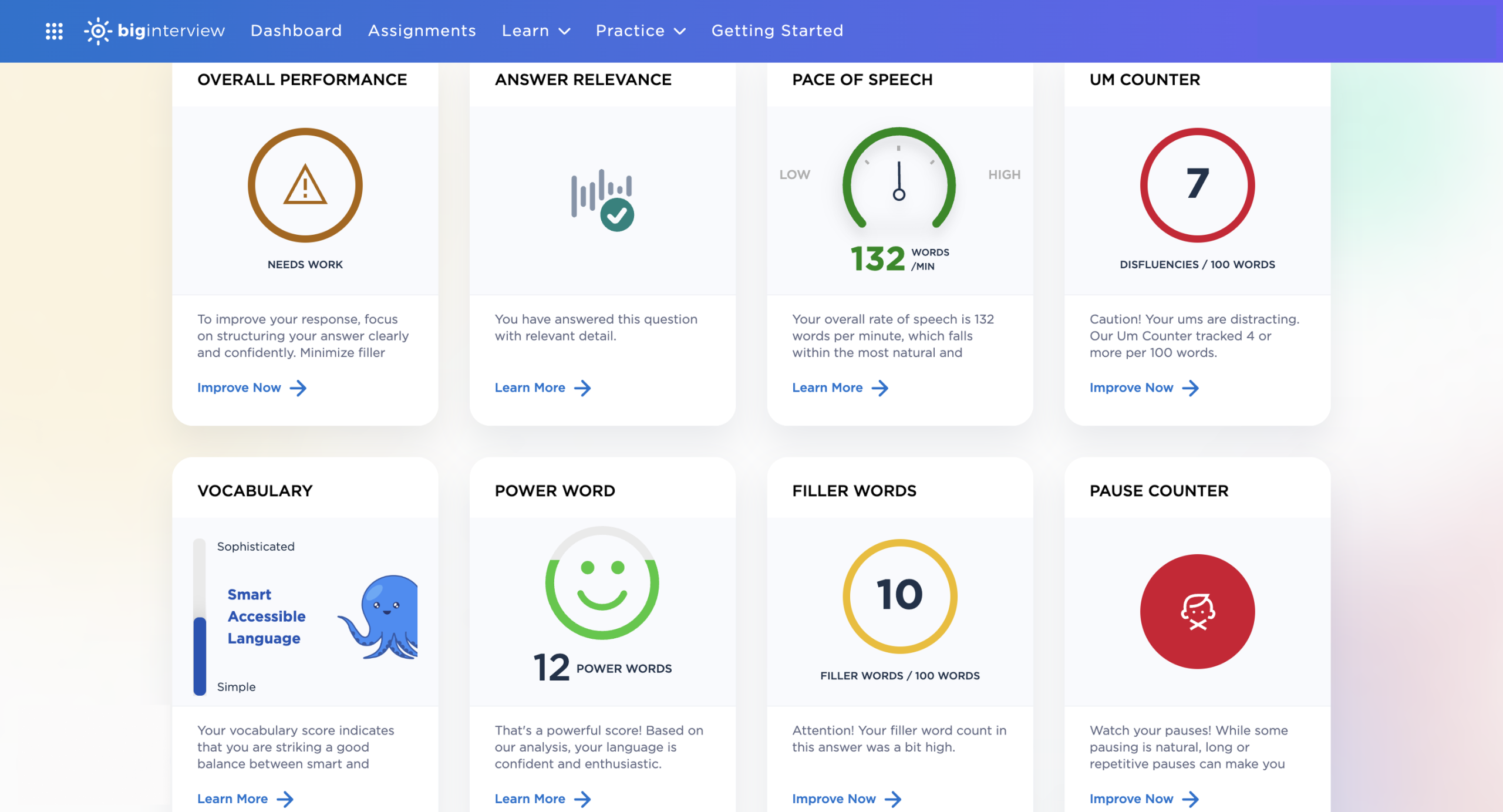 Big Interview has a powerful mock interview tool you can use to practice. First, you record yourself answering real interview questions. Then, you can watch the recording to see how you did, but you also get detailed AI feedback. The tool scores not only the content of your answers but also 12+ other important criteria, like how many times you said “umm,” your eye contact, and body language.